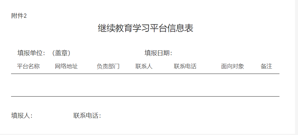 (三)各省级行业主管部门学习指南(参考格式见附件1)或工作通知、国家级和省级继续教育基地工作计划、各设区的市继续教育工作通知,请于3月底前报送我厅专业技术人员管理处,并同时发送电子版(标题注明:“XXX(市、部门、单位)2021年度继续教育材料”)。建有网络学习平台的,请一并填报《继续教育学习平台信息表》(见附件2)。