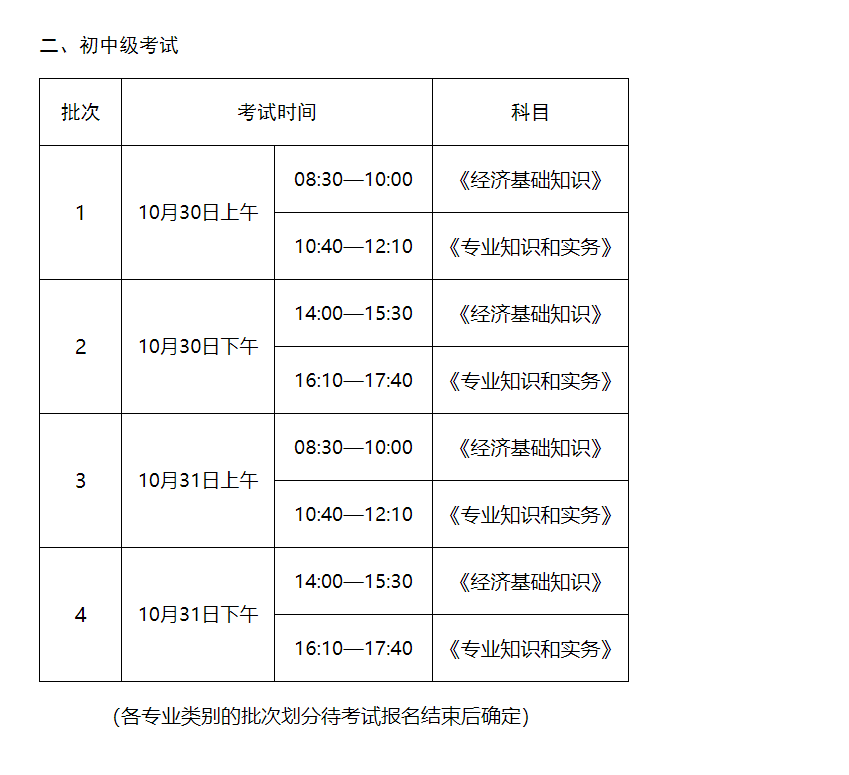 初中级考试于10月30日、31日举行,分两天上、下午4个批次实施(附件)。各级别及专业类别的具体考试时间和批次划分视报名情况另行确定。