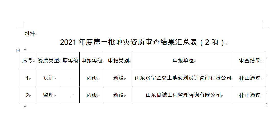 按照《关于调整实施部分省级行政权力事项的决定》(省政府令第333号)和《山东省自然资源厅关于做好地质灾害乙丙级资质审查工作的通知》要求,根据《地质灾害防治条例》(国务院第394号令)、《地质灾害危险性评估单位资质管理办法》、《地质灾害治理工程监理单位资质管理办法》、《地质灾害治理工程勘查设计施工单位资质管理办法》等相关文件规定,济宁市自然资源和规划局组织专家对2021年度第一批地质灾害危险性评估和地质灾害治理工程勘查、设计、施工、监理资质(以下简称“地灾资质”)申请进行了审查,共2项(2家单位)地灾资质通过审查,现予以公示,请社会监督。